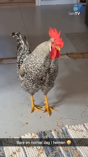 På Kongsvoll Gard på Folkestad tek gjerne hanen ein tur innom kjøkkenet for ein godbit eller to, seier Jeanette Eriksen. Det er forskjellig som dukkar opp på kjøkkenet når ein bur på gard, skriv ho vidare. Hanen, også kalla Kaptein Kakkel, er alt-etande, men denne dagen var det spaghetti og kjøttdeig på menyen. Favorittmaten er derimot mais. Videoen er sendt inn til SøreTV-konkurransen der ein kan vinne 1 kg smågodt.